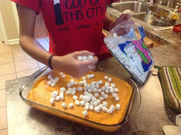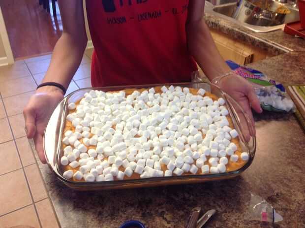 Extensión malvaviscos encima hasta que está completamente cubierto. Esto será probablemente sólo toma la mitad de la bolsa.