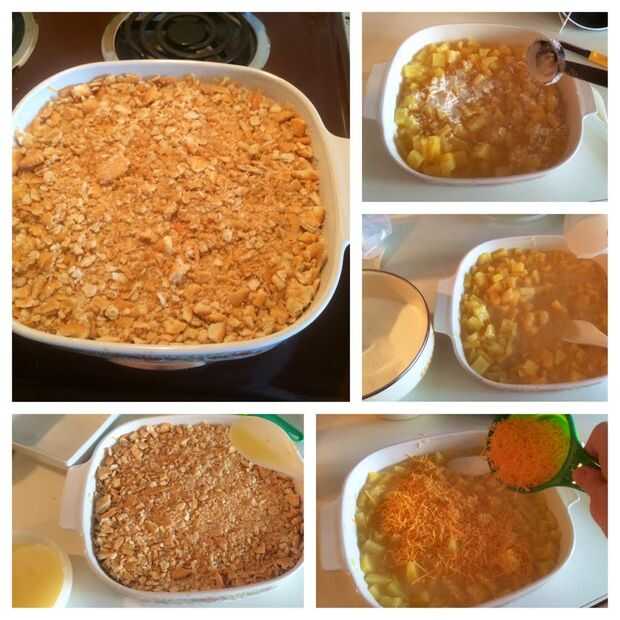 Verter sus pedacitos de piña en su cazuela, jugo y todo. Sólo utilizo el jugo de una de las latas (Vierta el jugo de una lata en una taza y dejar eso de lado), pero si quieres una cazuela más jugosa se puede utilizar el jugo de ambas latas.