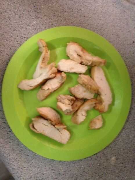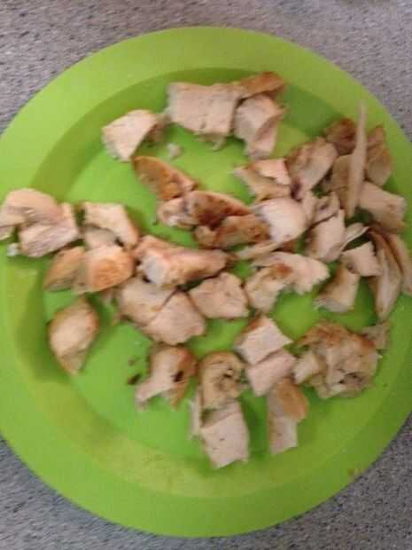 Cocinar el pollo y cortar en tiras pequeñas. Puede hervir el pollo, cocinar en el horno o freír en la cocina. (Una opción más fácil es usar pollo envasado precocinado como se muestra en la imagen).
