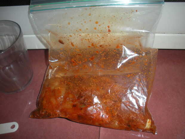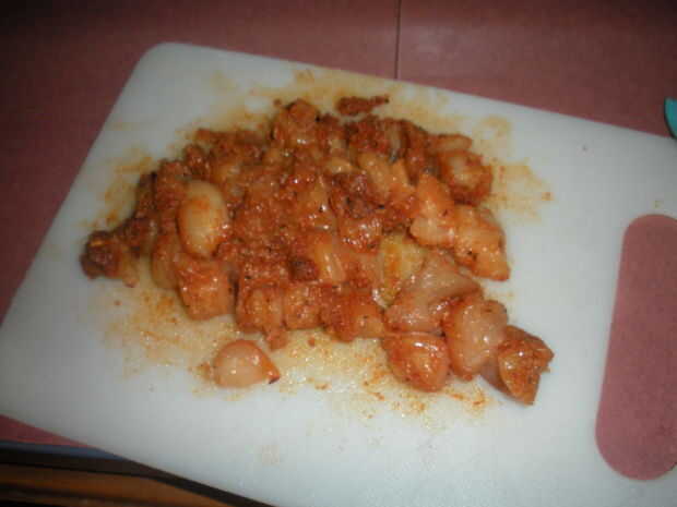 eliminar cualquier tendones o venas que en las ofertas del pollo si eso es lo que usas y cortado en tamaño bocado o piezas ligeramente más pequeñas en una bolsa o recipiente junto con el aceite de oliva y especias (mezclar las especias en un vaso antes de mano) Asegúrese de que el pollo está bien cubierto y dejar para marinar aproximadamente una whiule de 15 minutos Cocine el tocino , cebolla y pimiento verde