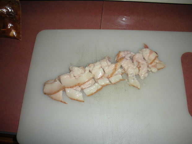 cortar 3 rebanadas de tocino en trozos pequeños y añadir a la sartén para empezar la cocción
