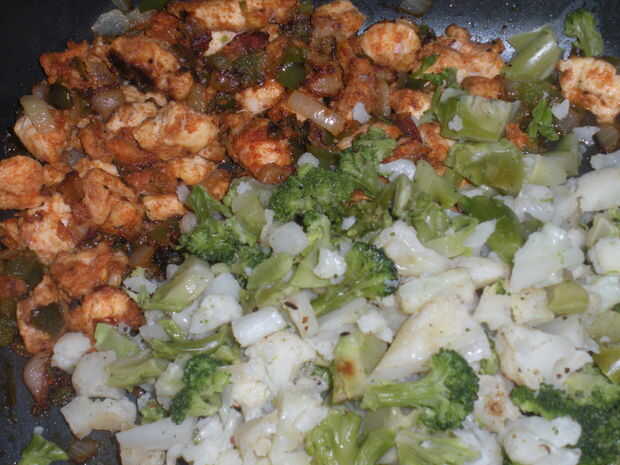 una vez que ha comenzado el tocino crujiente y la cebolla y se suavizan los papeles añadir los trozos de pollo marinados y 1/4 de taza de agua y tapa, revuelva ocasionalmente hasta que el pollo es cocido (unos 5 minutos) tuen el calor y deje que sienta