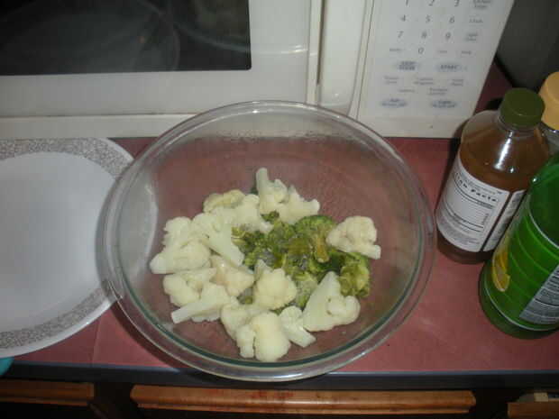 verduras habría estado bien, pero había congelado, eso es lo que usé. Coloqué alrededor de la mitad de una bolsa de coliflor y media una bolsa de brócoli en un recipiente cubierto el recipiente y cocinados en el microondas durante 3 minutos luego que corte los floretes en pedazos más pequeños y sazonada con una poco sal, 1/4 cucharadita de comino, cebolla en polvo, ajo en polvo seco mostaza, mezcló todo y microondas por 2 minutos cubierto
