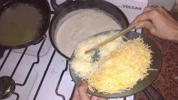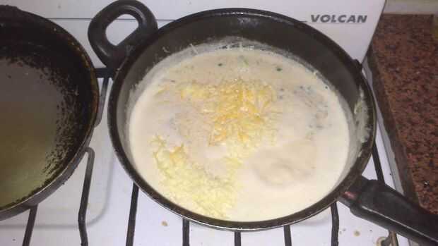 Añadir el queso. Y recuerda más queso, más sabroso! Reducir el calor para que el queso se funde pero no quema en la parte inferior.