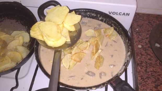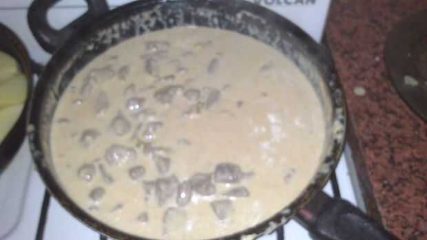 Cuando hierve la nata y el queso se derrita (y la carne se cuece), sal (pequeña cantidad porque el queso es salado) y pimienta. Luego agregar la carne y los jugos del recipiente. He añadido algunas ruedas de patatas fritas en la salsa.