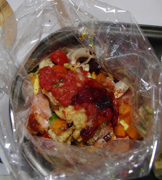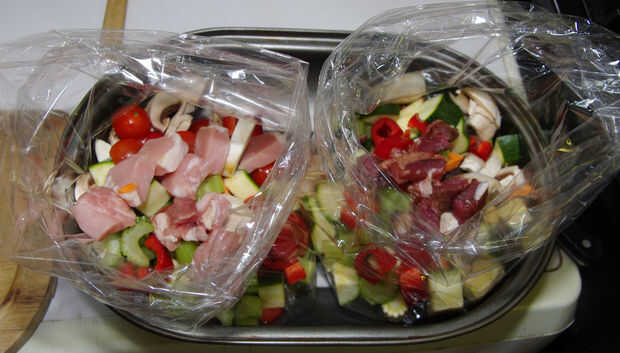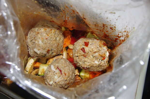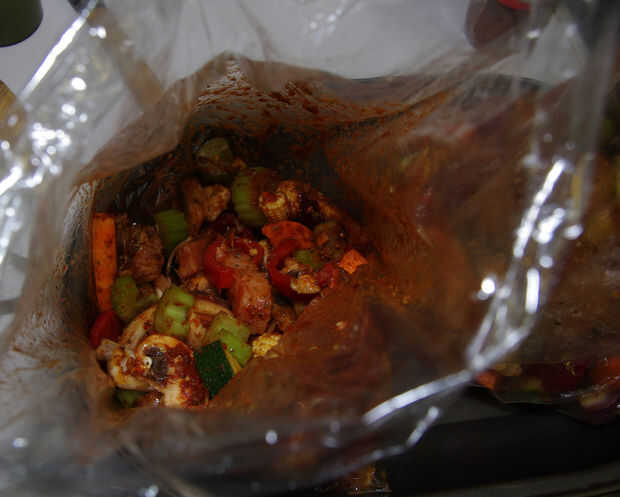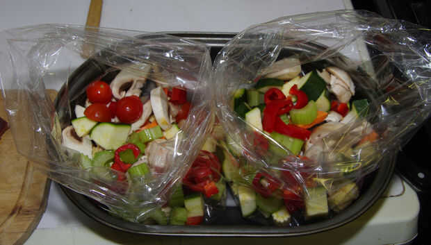 Compartir las verduras entre cada bolsa, añadir carne de elección (o no se si el vegetariano) entonces los aromas.