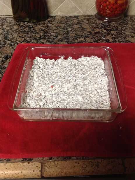 Extender la mezcla de salchicha y queso crema en el recipiente de vidrio sobre la capa de masa media luna.