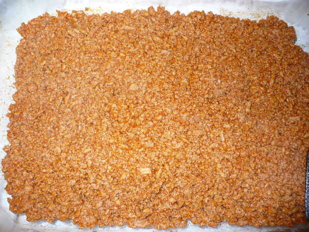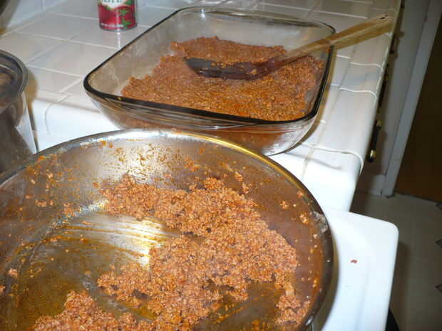 Separó la mezcla molida de pavo en la bandeja grande Hacer que la capa tan plano como sea posible, para que la patata tiene algún espacio para poner.
