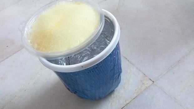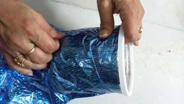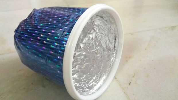 Ahora cubrir el lado exterior del cubo y lado externo de la tapa con este material y arreglo de partes con la ayuda de cinta de plástico.