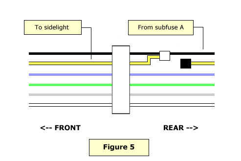 Trabajo en el lado del telar (ver figura 5) desacoplar el conector y cortar los cables negros y amarillos aproximadamente una pulgada y media del bloque. Pele los extremos de los cables negros y amarillos, todavía Unidos al bloque, ligarlos juntos, introducir la cola en un conector bala y prensado. Tomar la longitud restante del alambre negro corte, el extremo de la tira y conecte el otro extremo de la conexión de la bala. Con este hecho aislado la longitud adyacente del cable amarillo, comprobar la continuidad y vuelva a colocar los terminales de la batería (positivo y negativo) una vez que la prueba ha resultado satisfactoria. El bala conector y el cable amarillo aislado deben ser impermeables usando cinta de revestimiento o aislamiento.