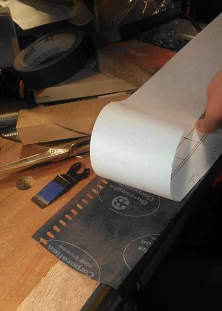 Una vez centrado como mejor parece, la plantilla en su lugar con el dedo pulgar hacer retroceder y coloque el papel boca abajo en el diapasón. asegurándose de que será en el primer traste. No hay necesidad de ir todo el camino hasta la tuerca. Lo suficiente como para conseguir el primer traste comenzó.
