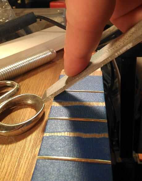Cuando los bordes de los trastes en ambos lados, retire la cinta y sentir a través de los trastes. Si el dedo siente rebabas o una sensación de estancamiento. Entonces ligeramente ir sobre él con el bloque de lijado en el borde como lo hizo antes como con el archivo plano.