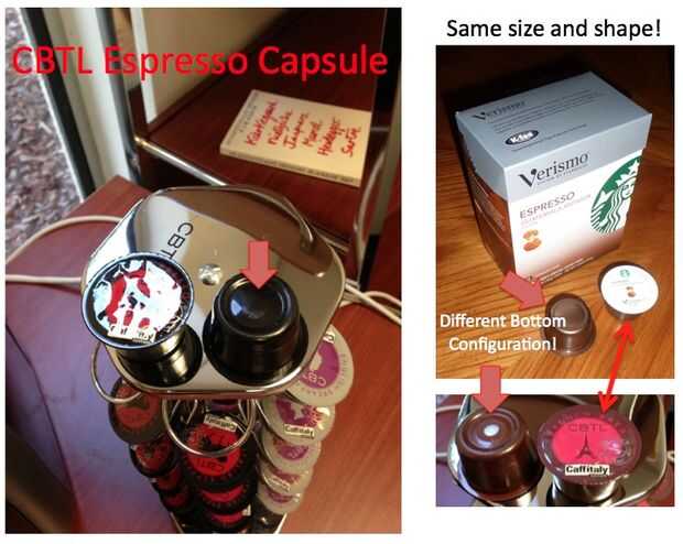 El Verismo tiene una configuración diferente en la parte inferior de la vaina que cualquiera de las cápsulas CBTL aunque tiene el mismo tamaño y forma.