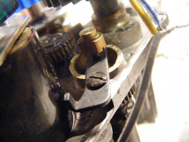 como dientes se utilizan para manejar la cosa, tuve que reinstalar el interruptor de retroceso que hace que el piñón de película libre del resto del mecanismo. encontré un pedazo de pokie de metal para hacer esto.