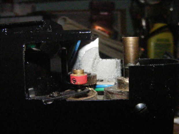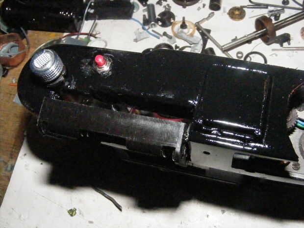 poner el lugar casi batería titular y luego una gota generosa de pegamento caliente y presione Inicio, poner también alguna pintura roja en lo botón de rebobinado.