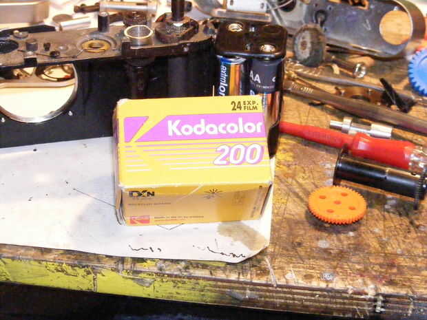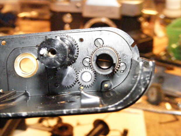 la cámara le faltaba su toma spoole así que tengo una zenit uno de la caja de piezas de repuesto y después de algunos fileing y corte para alinearla con la rueda dentada la até con un mal ajuste resorte tornillo y deslizamiento.
