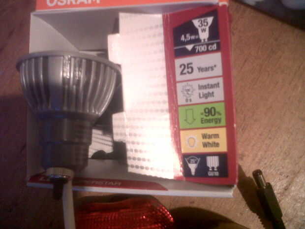 Puede haber unidades mejor comenzar con ser encontrado si fregar el internet, por ejemplo 12V, o solo el LED de 3 LEDs. Me gustó este OSRAM uno porque está cerca de estancos, aparte viene con tornillos y se ve la parte. (Lamentablemente no tomo fotos de la atención unmodifed - pero se pueden imaginar los terminales GU10 en el lugar de la salida del interruptor y cable en la foto de abajo, otro sabio se ha modificado externamente.