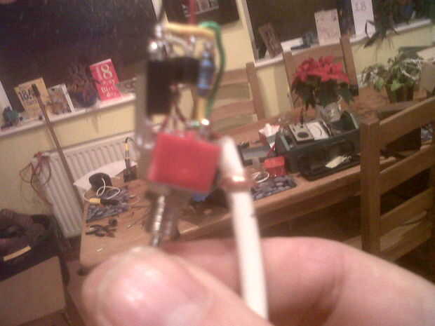 Usé un MosFET, transistor NPN, resistor de colector (47Kohms) y una selección de resistencias de detección actuales (1.5ohms, 4.1ohms). Acabo de comprar todo lo que tenía la tienda local. Éstos dieron 370 mA y 180 mA a través de los LED para proporcionar un modo de alta potencia y una modo de ahorro de batería.