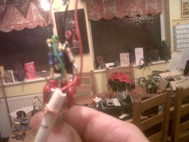 La electrónica produce un suministro de corriente alterna variable de 14Vac y 350 mA. a la placa de LED. Esto sale del transformador de salida final. Hay un montón de electrónica conduce el transformador, presumiblemente garantizar que el resultado final es una constante corriente en los LEDs. En la placa de LED es un diodo de rectifiying, un par de condensadores y resistencias de una (y los LEDs en serie). Este da una media onda rectificador y bomba de carga. Esto significa sin desoldadura los LEDs y con un osilliscope es muy difícil para asegurarse de que el ciclo actual y el deber en realidad en los LEDs. Lo único para ir era 9.6Vdc resonably constante a través de los 3 LEDS.