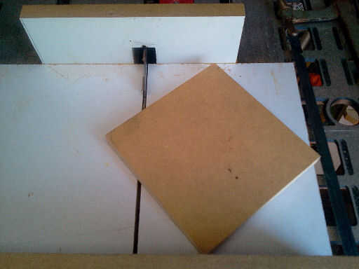 que corte el círculo con mi sierra de mesa. Hacerlo bajo su propio riesgo ya que la Sierra de mesa es una herramienta peligrosa... Hay videos en youtube que muestra cómo hacer esto pero de todas formas estoy subiendo mis fotos aquí. Comencé a clavar un clavo en 62mm desde el corte de sierra en un trineo de Sierra de mesa pequeña. Luego cortar la cabeza del clavo y presentó a un punto. Me corte un cuadrado de 65 mm de una pieza de MDF y dibujar las diagonales para marcar el centro. Empujé el centro de la Plaza sobre el clavo hasta que asiente completamente en el trineo.