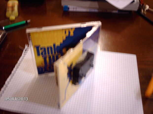 Paso 1 = te te necesita un CD, su tapa, una lata vacía, un cuchillo, un poco de pegamento, el mecanismo de un reloj de alarma, algo de calor, una regla, un lápiz...