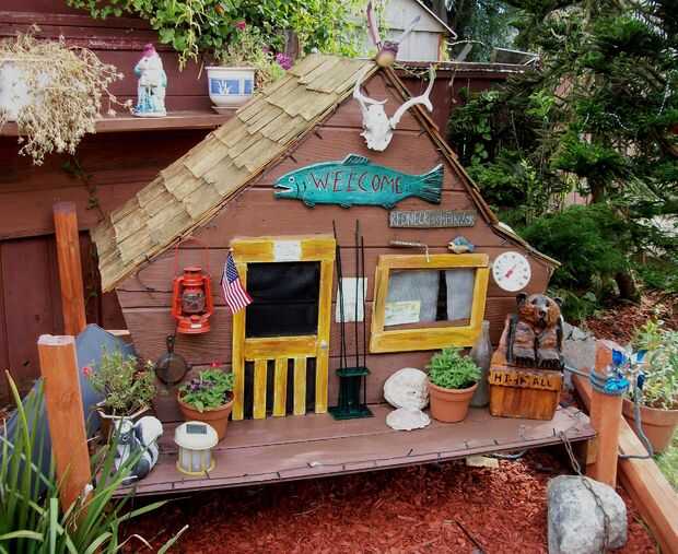 Yo miraba todos esos nidos de lujo y tuvo la idea, por qué no uno más grande mucho mas grande mina está parado alrededor de 4 pies de altura no un pájaro casa pero una decoración de patio trasero. Caramba que podría ser una caseta de perro pero la mía es sólo para las miradas y mi disfrute personal. Utilicé los restos de madera que tenía que poner alrededor de viejos pedazos de la cerca que son perfectos para las paredes de la choza. Comprar la madera de tipo polo redondo en el lugar de grandes mejoras para el hogar por alrededor de 6 dólares