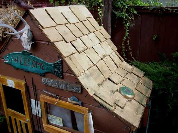 La azotea era muy fácil tomar algunas delgadas 1/4 pulgada y cortan a la dimensión de la línea del techo en la choza y el tornillo en la parte delantera y traseros paneles tomé ¼ capas y cortan todas las tejas con inicio de cortes al azar en la parte inferior y tornillo cada uno en mi camino a la cima. Esa cosa de círculo verde que ves es una luz solar tiki.  En la noche parpadea el interior como en una linterna.