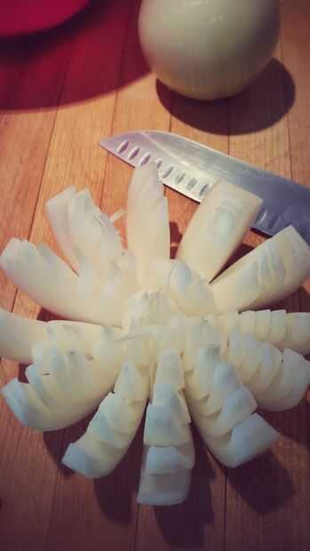 Hacen 4 incisiones en ángulos derecha toda la manera a través la cebolla sin cortar la parte de raíz.