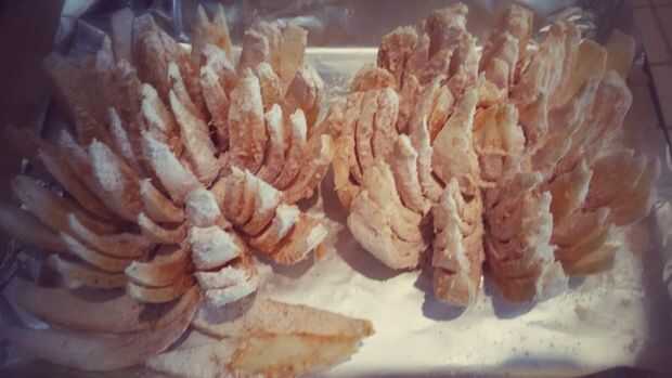 Cubrir la cebolla con los ingredientes secos mezclados, asegurándose de cubrir todos los pétalos. Luego cubrir con los huevos batidos y el exceso de goteo. Volver a los ingredientes secos y el huevo la capa uniformemente. Poner la cebolla en el congelador durante 1 hora.