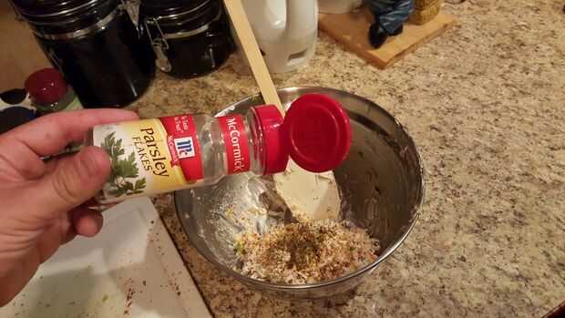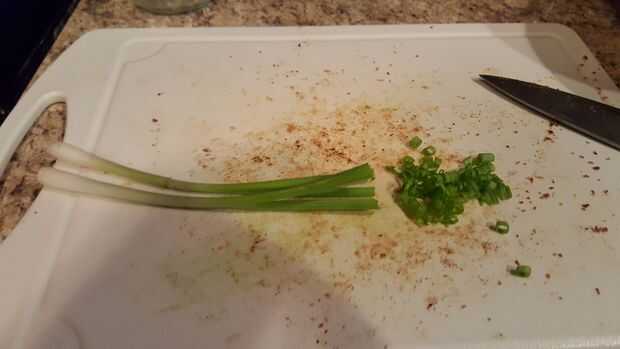 Es tiempo de desmenuzar algunas cebollas verdes. Al igual que todo lo demás en un cheeseball añades cebolla al gusto. Usé 2 tallos en mi pelota. Una vez que se cortan añadirlos a la bola.