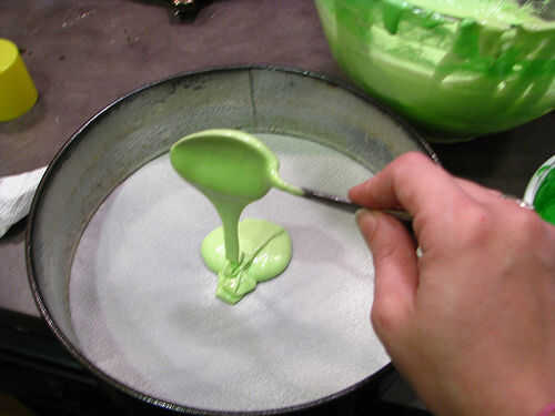 El siguiente color y añadir la misma cantidad de cucharadas de la masa, justo en el centro de la primera Poza. Seguir construyendo, siempre desde el centro. Notarás que la masa comienza a extenderse hacia los bordes de la cacerola. Una vez que mi masa llegue a los bordes, generalmente siento que he utilizado bastante la masa. Usted debe terminar con un bullseye!