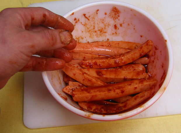 Mezclarlas hasta que están todo bien cubiertas. Deje reposar un cierta cantidad de tiempo. Ya hay un montón de errores muerte un hotdog ya, por lo que usted está sólo multicolor con este paso para embalsamar.