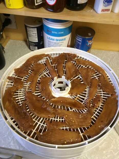 Si no tienes un deshidratador puede utilizar el horno también. Yo solía usar el horno antes de que llegué mi deshidratador y funciona igual de bien, pero tarda más. Línea de la parte inferior del horno con papel de aluminio para coger los goteos. Luego puede poner el pollo sobre una rejilla, así que hay espacio para que circule el aire. Programar el horno a 200 y apuntalar la puerta del horno abierta un poco con una cuchara de madera u otro utensilio similar de no fusible. Si usted tiene un pequeño ventilador puede apuntar en el horno para ayudar a mover el aire.