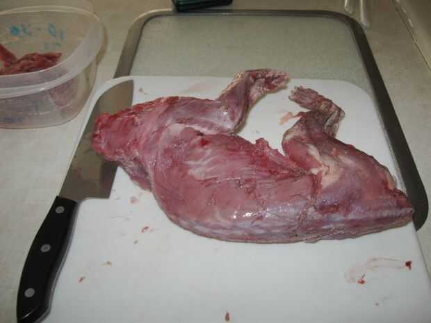 El oposum de la piel tan pronto como sea posible después de la cosecha. Quitar el cráneo, pies, cola y órganos de la canal y recorte el exceso de grasa. Enjuagar la carne con agua fría, hasta que el agua salga limpia. Resultado debería verse como la foto de arriba.