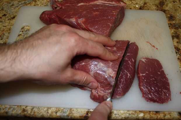 Una vez que se descongele la carne en el exterior pero aún un poco congelado en el interior, ponlo en una tabla de cortar bien lavadas y acaricíele seca con una toalla de papel. Recortar tanto la grasa como sea posible luego rebanar la carne en ⅛"¼" (3-6 mm) láminas. Corte con el grano con un muy agudo obras de cuchillo (no dentadas) mejor. Aquí estoy usando un filete redondo superior, puede usar cualquier corte de carne te gusta pero recuerda que la carne con un alto contenido de grasa se pone rancia más rápidamente, que hace de esta empresa cecina filete mignon práctico pero decadente!
