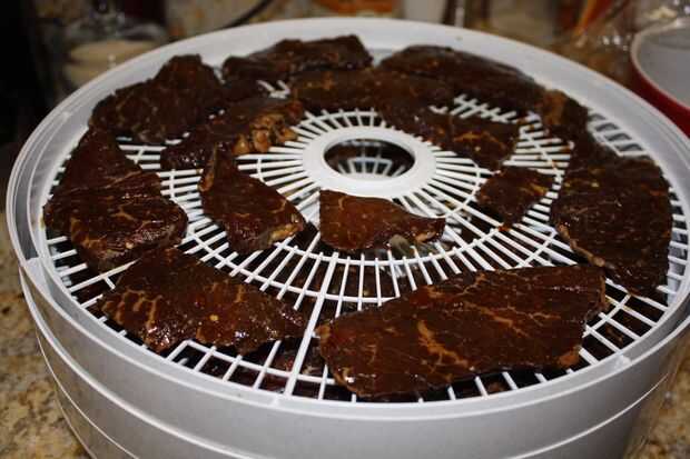 Retire las tiras de carne de la marinada y colocar en el bastidor en una sola capa sin superponerlas, permitiendo un poco de flujo de aire alrededor de cada pieza. Al retirar las tiras de carne de la marinada, que puedan colgar para secar, quieres algún adobo para cubrir la carne tira pero no demasiado. Montar tu deshidratador y a 160° F (~ 70° C).
