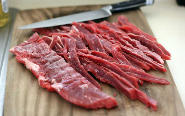 Cortar la carne en tiras muy finas. Arrachera es ideal para esto porque tiene un grano muy obvio a él. Lo único que no como unos lo delgado el corte era, hacer mis tiras fuera muy estrecho.
