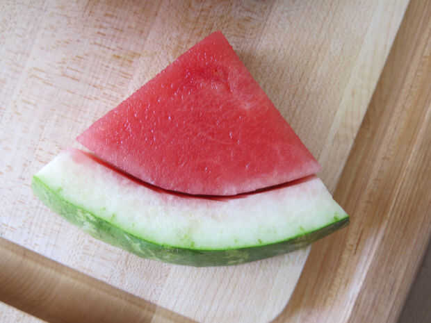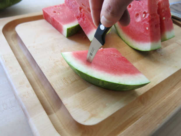 Hay muchas maneras de cortar una sandía, pero prefiero hacer mi manera que es más eficiente, menos desperdicio y al mismo tiempo este método también elimina la mayoría de las semillas de la carne.Lo que necesita es una tabla de cortar, un cuchillo, u