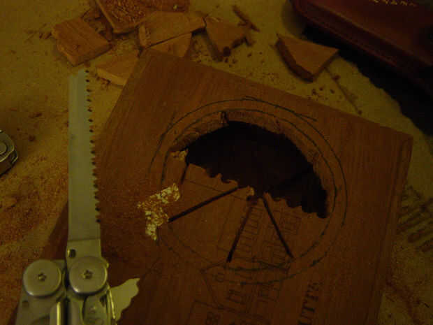 Sin el agujero vio, que he intentado cortar con solo la sierra pero cambió encima a aserrar radios, áspero aserrado la circunferencia y luego terminar con el x-acto y lima redonda. Parece horrible, fue horrible hacer y me hizo desear que había pasado $20 en una sierra del agujero.