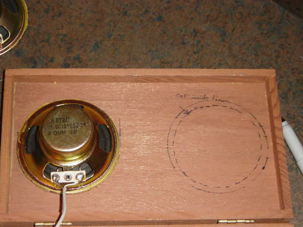 Así que me cambié a dibujar los contornos de altavoz en la parte superior de la caja. ASEGÚRESE DE QUE LA TARJETA DE CIRCUITOS PUEDE SENTARSE ENTRE LOS ALTAVOCES!