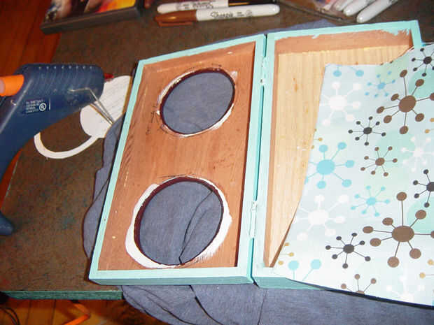 Después de la pintura exterior. Quise ocultar los altavoces y agarró algo sobrante de tela y una pistola de pegamento caliente. Cortar tela para caber dentro de la caja. Simple.