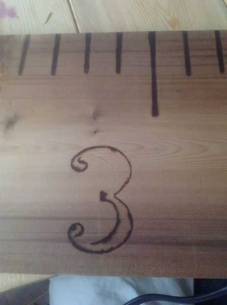 Siguiente parte es la combustión usando el quemador de madera herramienta/arma de soldadura. Comienza calentando la herramienta, una vez que está caliente, trazar el contorno del número desde el interior. Esto ayuda a parte externa del número de la quema sin querer y le da una línea exterior más suave y el control. Cuando se quema el contorno del número del esquema ir y comenzar a quemar el interior del número con la veta de la madera. Esto ayuda a quemar más suavemente. Otro truco que uso es utilizar una regla de metal para hacer líneas rectas.