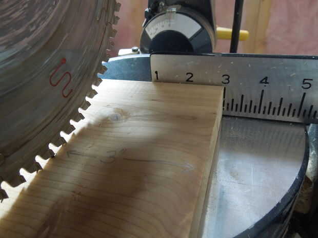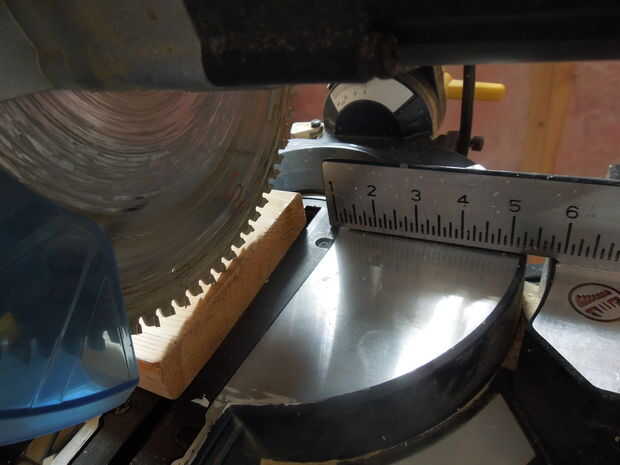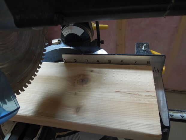 La izquierda en 5/4 x 6 x 12 placa deberá cortarse en un montón de piezas 8 1/4 pulgadas de largo. El tamaño exacto no es importante, es que 8 1/4 pulgadas es un veces y media el ancho de un 5/4 por Junta 6 (más sobre esto más adelante). Si su sierra de ingletes tiene una escala de longitud de corte en la cerca se puede utilizar para la velocidad (ver foto 4), como la longitud de la exaxt no es crítico.