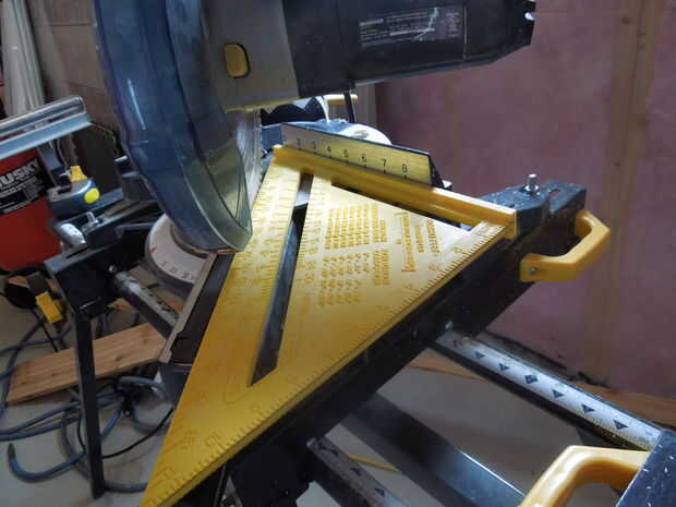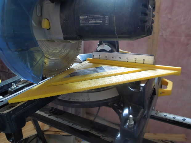 Tomar una 2 x 4 x 8, Plaza el extremo y cortar un trozo de 46 pulgadas. Tome la izquierda más de 50 pulgadas pieza y corte exactamente en la mitad (haga una marca de 25 pulgadas y corte con la hoja centrada en la marca). Tomar las dos 25 pulgadas piezas y mitre que los dos extremos en un ángulo de 45 grados por lo que puede ser utilizado como un travesaño (ver foto 5). Recuerde utilizar el cuadrado de la viga para fijar la sierra en 45 grados de ángulo (ver foto 6), no utiliza la escala de ángulos. Repita todo el proceso para otro 2 x 4 x 8. Tendras 2 pedazos de 46 pulgadas y 4 inglete Cruz llaves de 25 pulgadas.