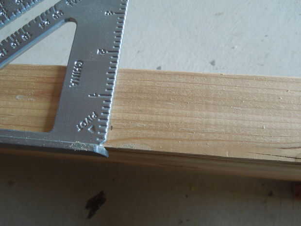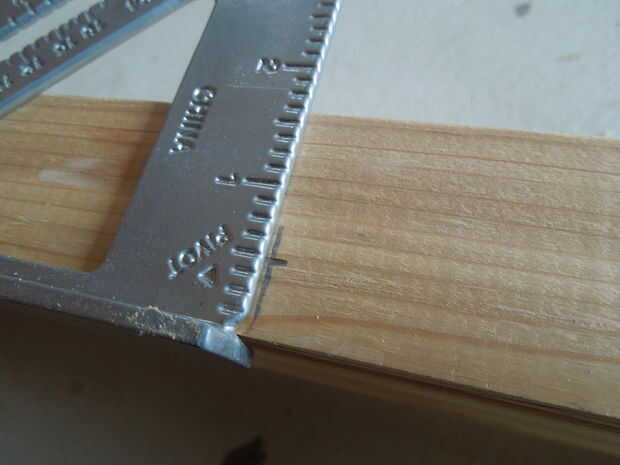 A continuación debe Marque las ubicaciones de sus orificios. Puede utilizar su plaza de viga para dibujar una línea perpendicular a cada una de las marcas de lápiz realizadas. A continuación, puede utilizar la escala de medición en la plaza para 1/2 del borde de la tapa y haz otra marca allí (ver fotos 5 y 6). Luego han hecho efectivamente una "Cruz" de la broca entrar. Repita para todos los lados.