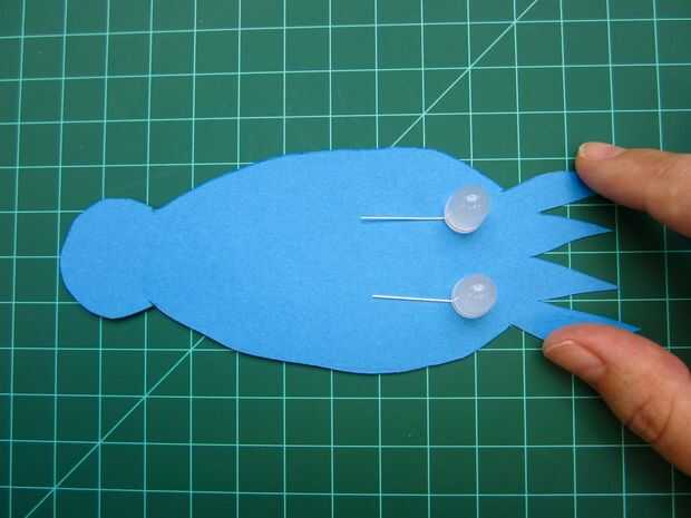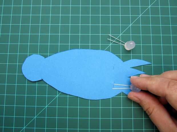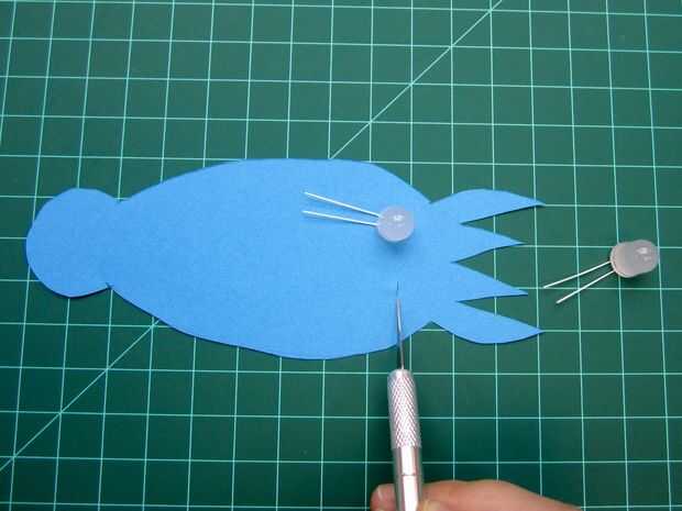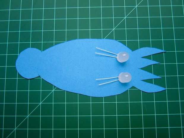 A continuación encontrar tu LED y doblar las piernas en 90 grados a la cabeza de LED. Colóquelas en su papel de aproximadamente donde usted quiere los ojos de cefalópodos a sentarse detrás de los tentáculos. Corte una pequeña raja en el papel directamente debajo de los LEDs.
