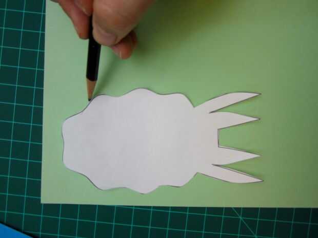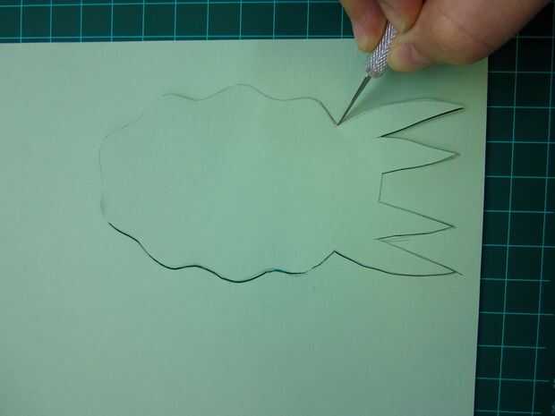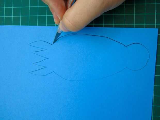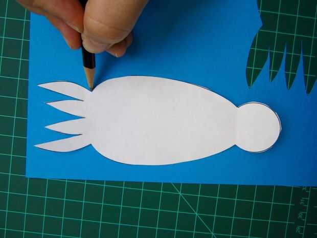 A continuación, trazar el cuerpo del cefalópodo más sobre el papel azul y recórtalo. La gota redonda enfrente de los tentáculos es la pestaña de la batería.