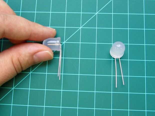Observe que una pata del LED es más larga que la otra. Pegar la pata más larga del LED a través de la ranura para que tenga una pierna a cada lado del papel.