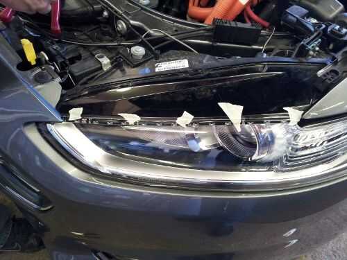 Para encontrar el justo la posición correcta para la tira de LED en el borde de la campana, pegadas las tiras abajo con cinta adhesiva y cerrada de la campana para probarlos. Después de unos poco de reposicionamiento intentos finalmente encontramos el lugar adecuado, que es casi 1/4" por debajo del borde negro del faro.