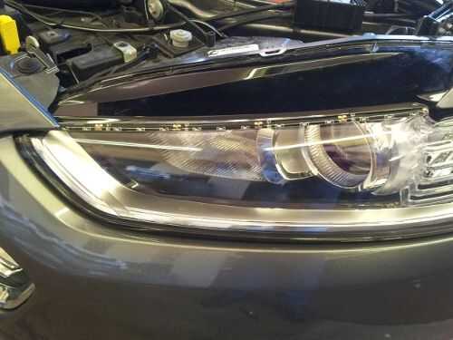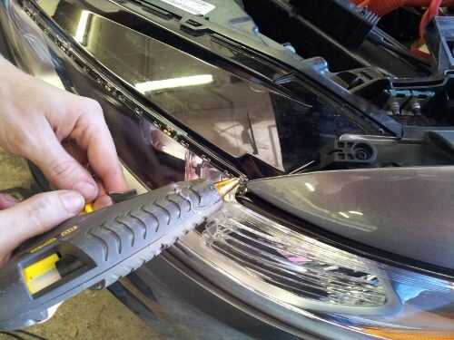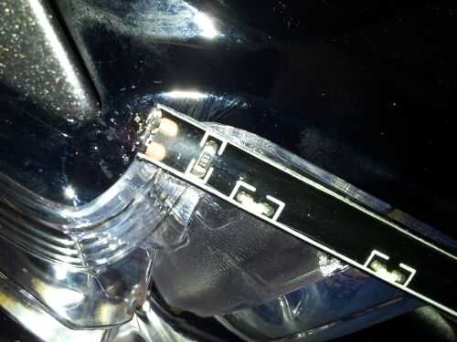 La posición final de las tiras de LED terminó siendo aproximadamente 1/4 de pulgada por debajo del borde negro de la Asamblea del faro. Los extremos cortados de las tiras de LED fueron caliente pegado a la Asamblea del faro para que ellos serían permanecer en el lugar y para impermeabilizarlas.